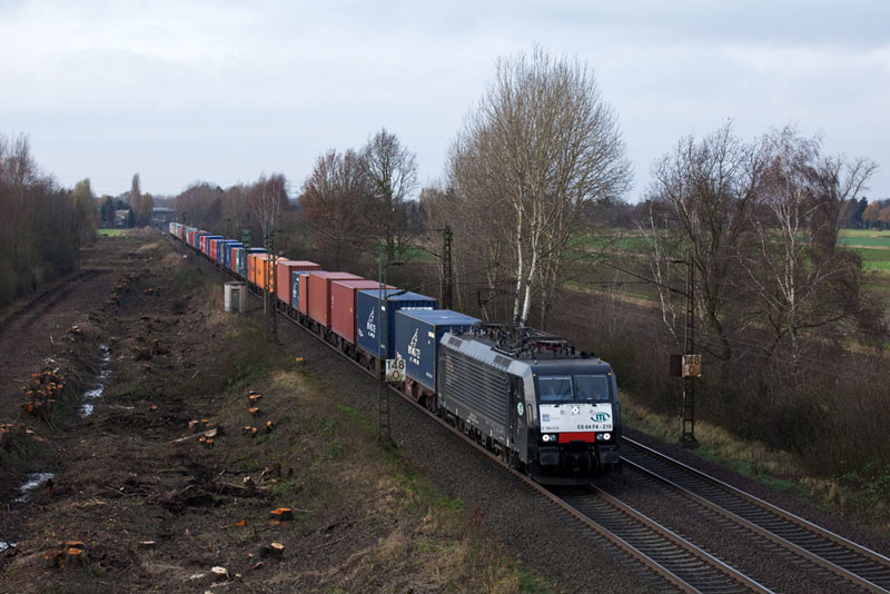 | Die schwarze ES 64 F4-210 der ITL mit einem Containerzug. Borstel, 26. November 2011 |