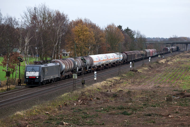 | Die schwarze ES 64 F4-158 der MRCEdispolok mit einem gemischten DB Schenker-Güterzug. Borstel, 26. November 2011 |