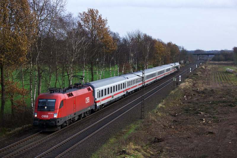 | Der InterCity 2170 von Frankfurt nach Westerland mit der ÖBB 1016 002-6. Borstel, 26. November 2011 |