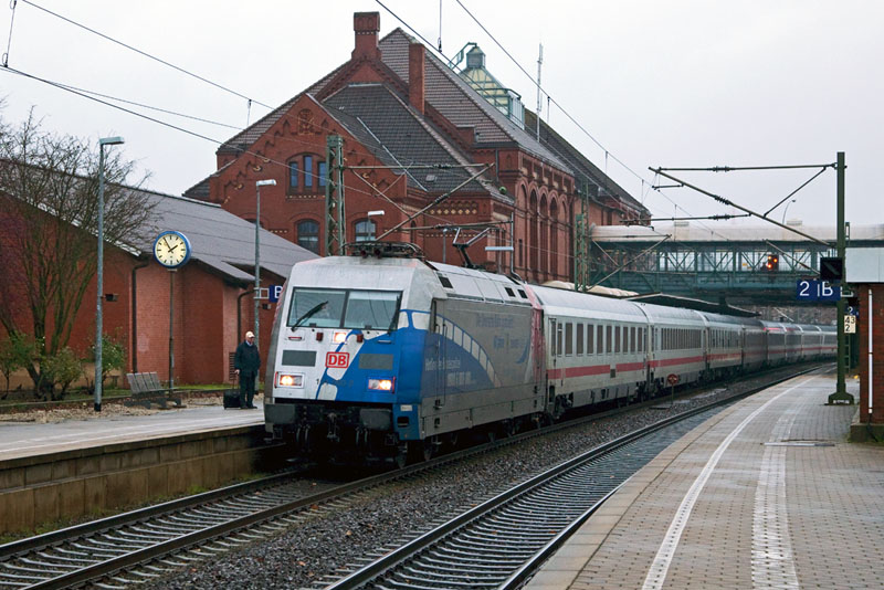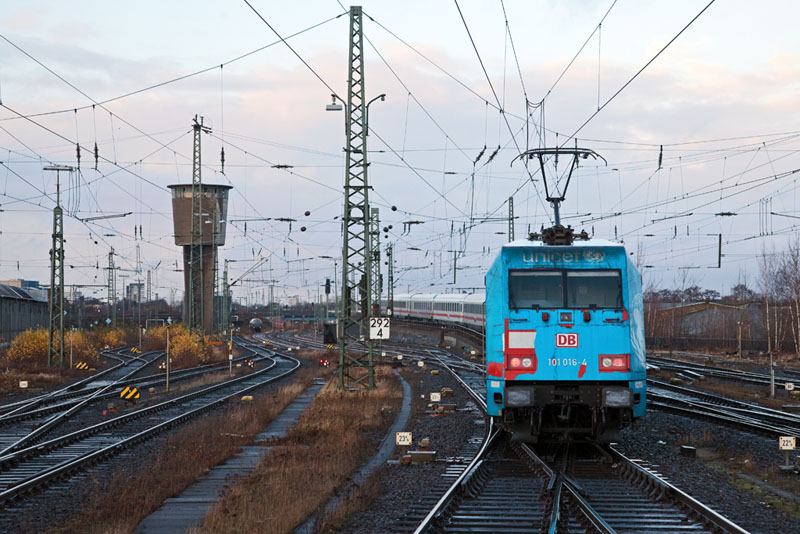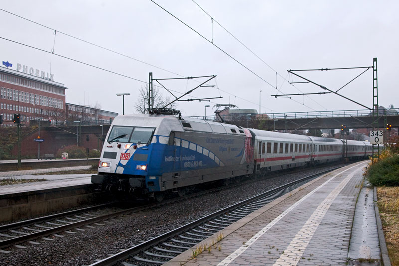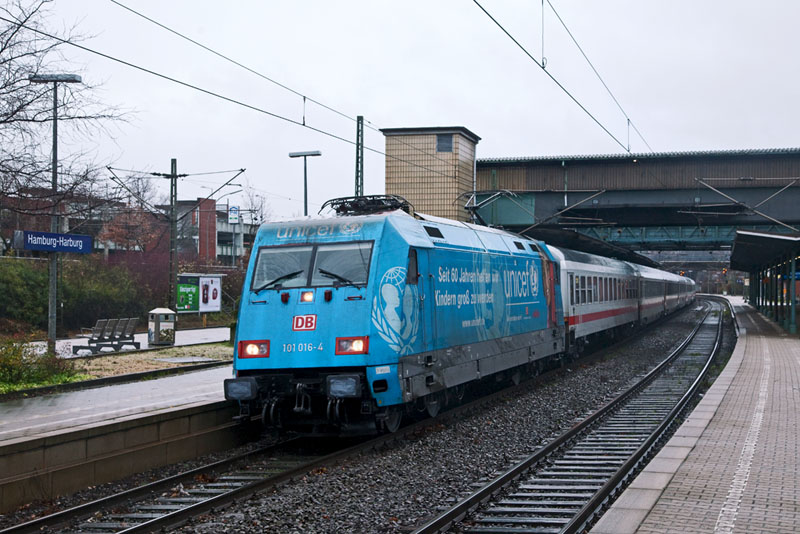 | Auch die "unicef" 101 016-4 kam vorbei – mit dem IC 2028. Hamburg-Harburg, 3. Dezember 2011 |