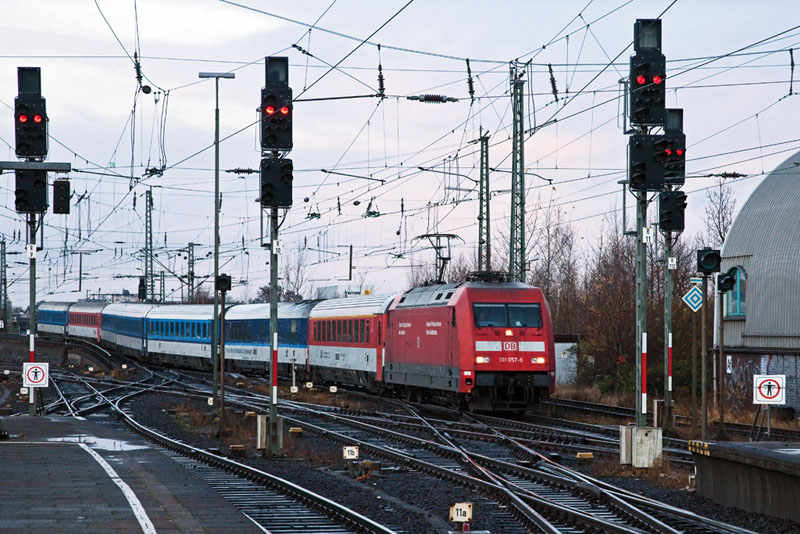 | Einfahrt des EuroCitys 176 von Prag mit tschechischen Wagen und der 101 057-8. Hamburg-Altona, 3. Dezember 2011 |