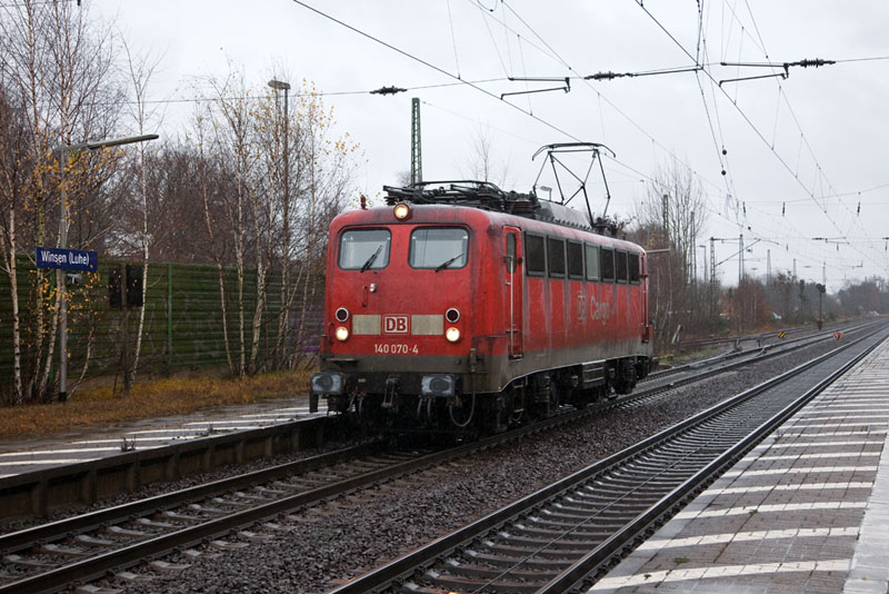 | Es schüttete ohne Ende, und dementsprechend sah die 140 070-4 so aus… Winsen (Luhe), 3. Dezember 2011 |