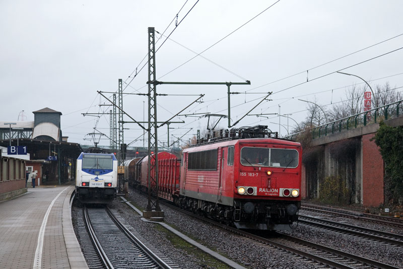 | Einen gemischten Güterzug hatte die 155 183-7 in Richtung Maschen zu bringen. Hamburg-Harburg, 3. Dezember 2011 |