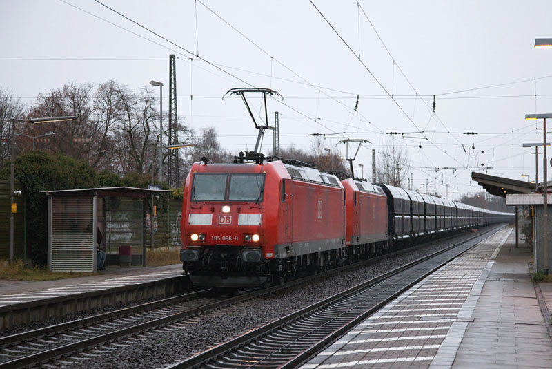 | Diese ellenlange ERR-Schüttgutwagenschlange brachten 185 066-8 und 185 006-4 nach Hamburg. Winsen (Luhe), 3. Dezember 2011 |