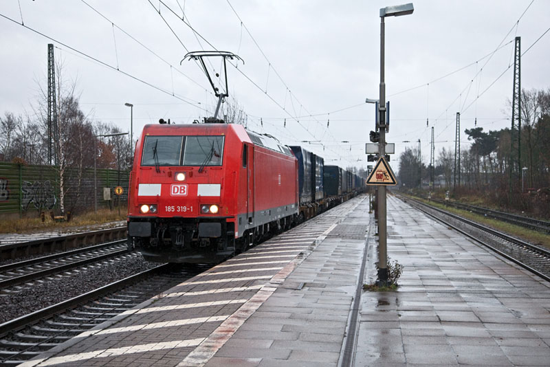 | Als Gegengleisfahrt durchfuhr dieser Skandi-Güterzug mit der 185 319-1 den Bahnhof. Winsen (Luhe), 3. Dezember 2011 |