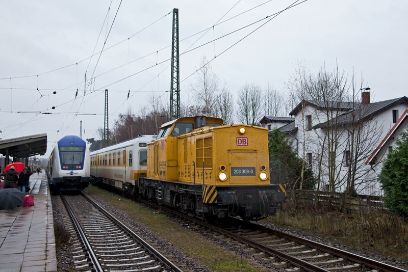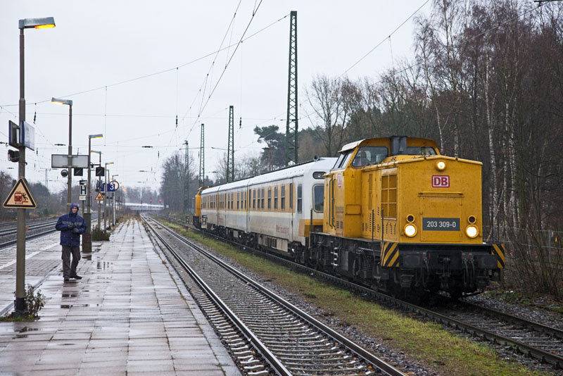 | …die 203 309-0 nach Winsen (Luhe) auf eins der mehreren Messfahrten. Winsen (Luhe), 3. Dezember 2011 |