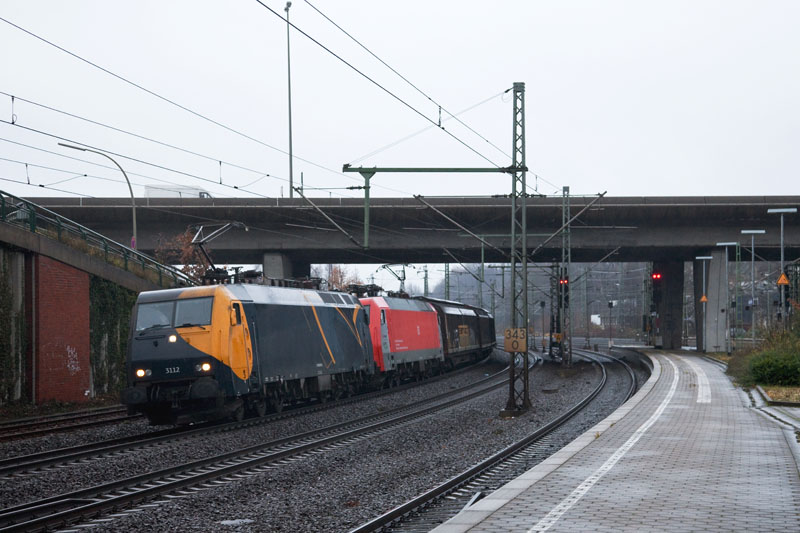 | Ein ganzes Dutzend Achsen – die EG 3112 und EG 3103 vor einem schweren Skandi-Güterzug von Maschen! Hamburg-Harburg, 3. Dezember 2011 |