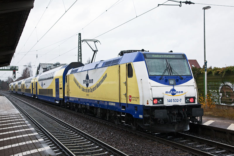 | Die 146 532-7 mit der "50 Miliionen Km-Werbung"… Winsen (Luhe), 3. Dezember 2011 |