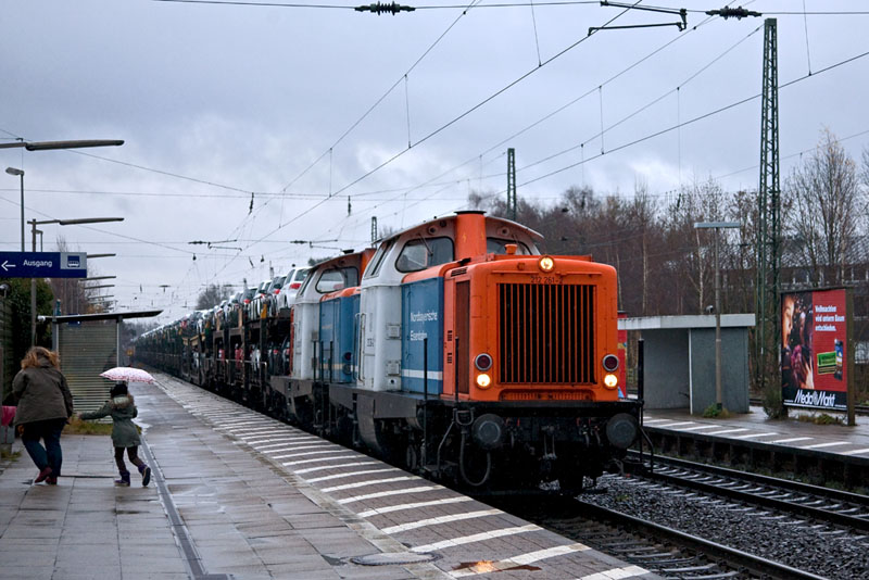 | Mutti mit Kind auffe Flucht - als die beiden V100 (212 261-2 und 212 270-3) der NbE mit einem ARS Altmann-Autologistikzug nach Cuxhaven durchröhrten! Winsen (Luhe), 3. Dezember 2011 | ||