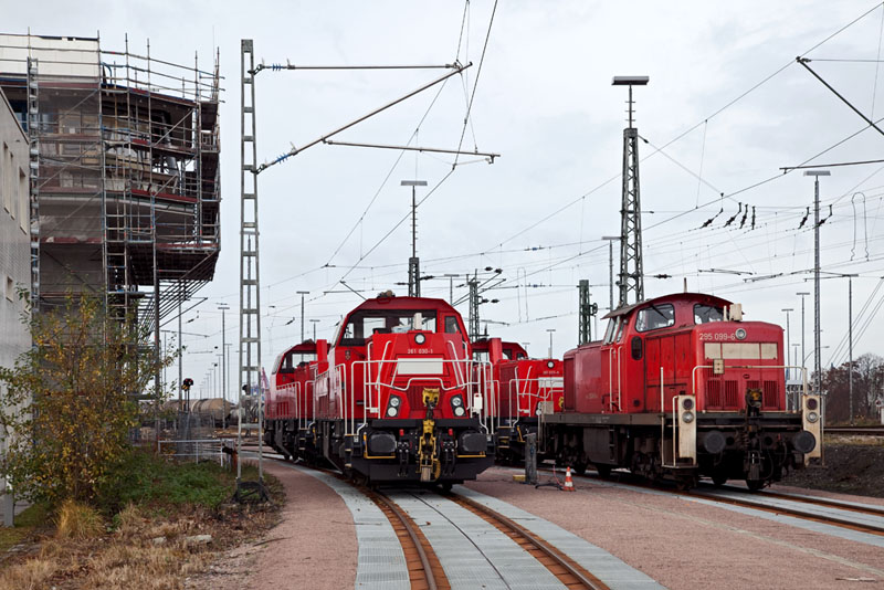 | Drei Gravitas und eine V90… 261 030-1, 261 038-4, 261 033-5 und 295 099-6. RBF Hamburg Süd, 4. Dezember 2011 |