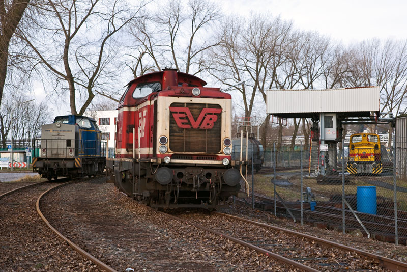 | Bei Bominflot standen V 1802 der MWB und die 410 02 der EVB. Hamburg-Waltershof, 4. Dezember 2011 |