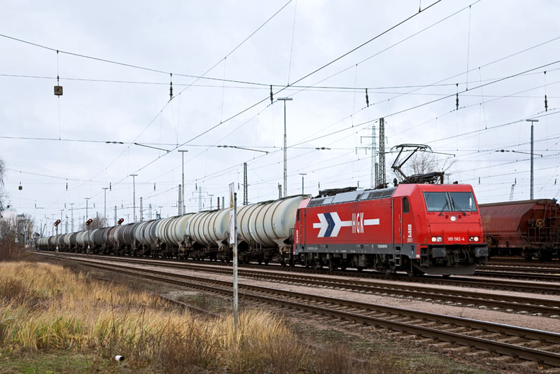 | Abfahrtsbereit vor einem Kesselwagenzug war die 185 582-4 der HGK. Hamburg-Hohe Schaar, 4. Dezember 2011 |