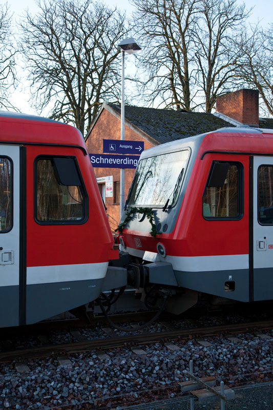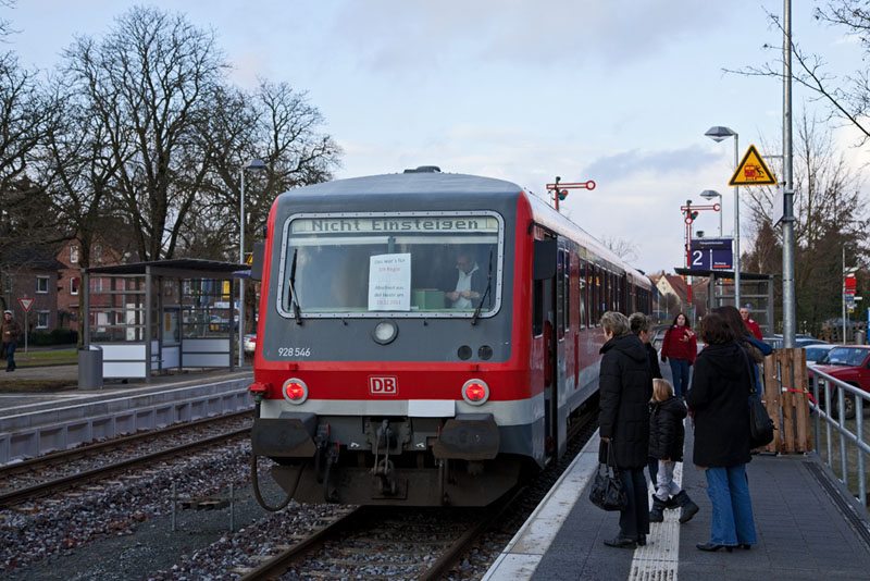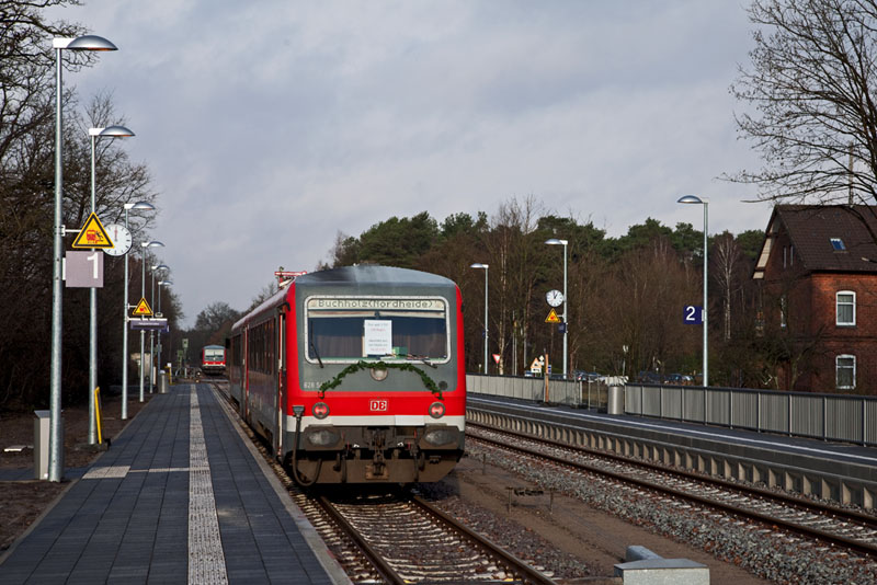 | 628/928 546 endete als Zwischentakt von Buchholz (i.d. Nordheide) und die Personale samt ihrer Familien schmückten den Triebwagen. Schneverdingen, 10. Dezember 2011 | ||