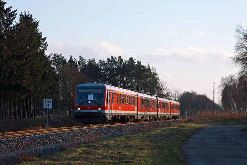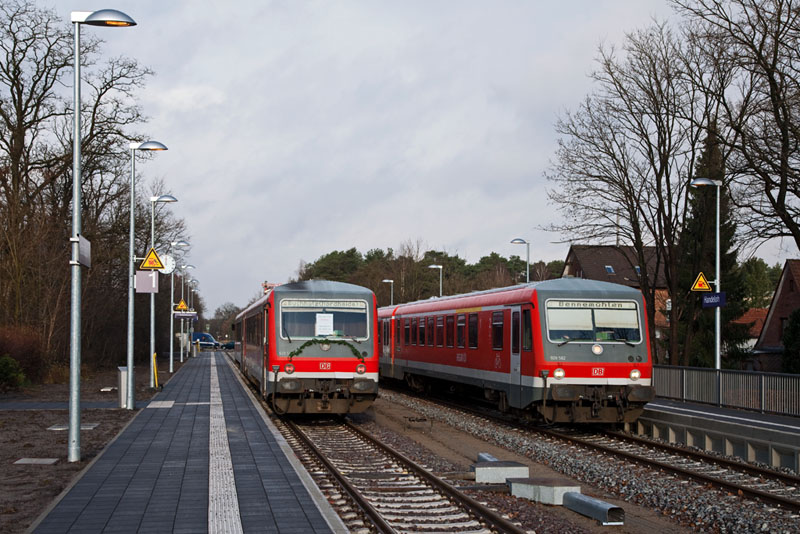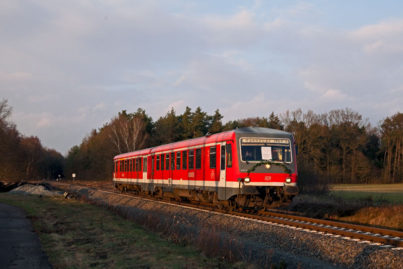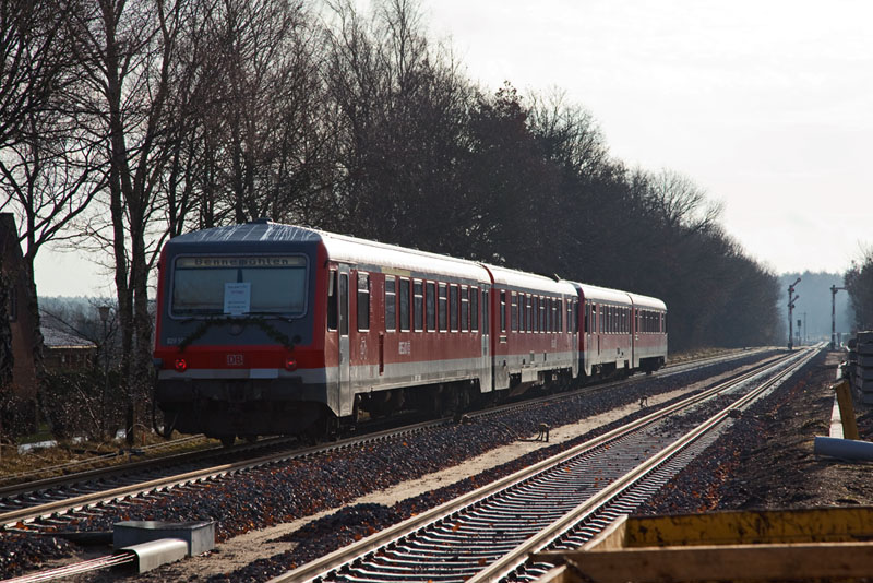 | Der Triebwagen 628/928 549 wartete die Zugkreuzung ab – zum Abschied von DB Regio ist er geschmückt… Handeloh, 10. Dezember 2011 |