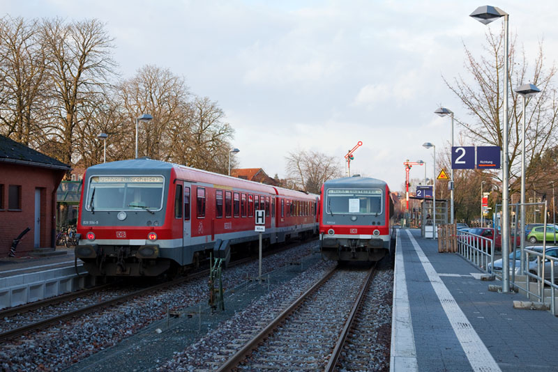 | Einfahrende Regionalbahn 14768 mit 628/928 609 und 628/928 554 nach Buchholz (i.d. Nordheide). Schneverdingen, 10. Dezember 2011 |
