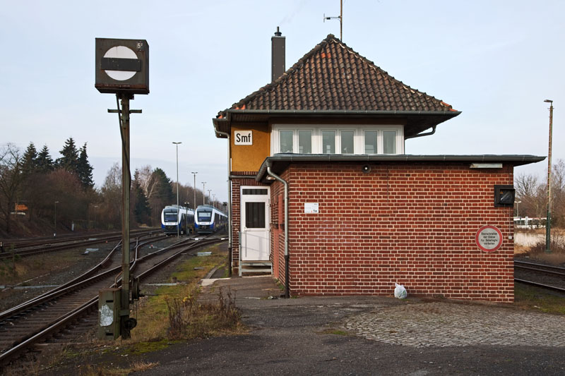 | Das Stellwerk Smf am westlichen Bahnsteigende. Soltau (Han), 11. Dezember 2011 |