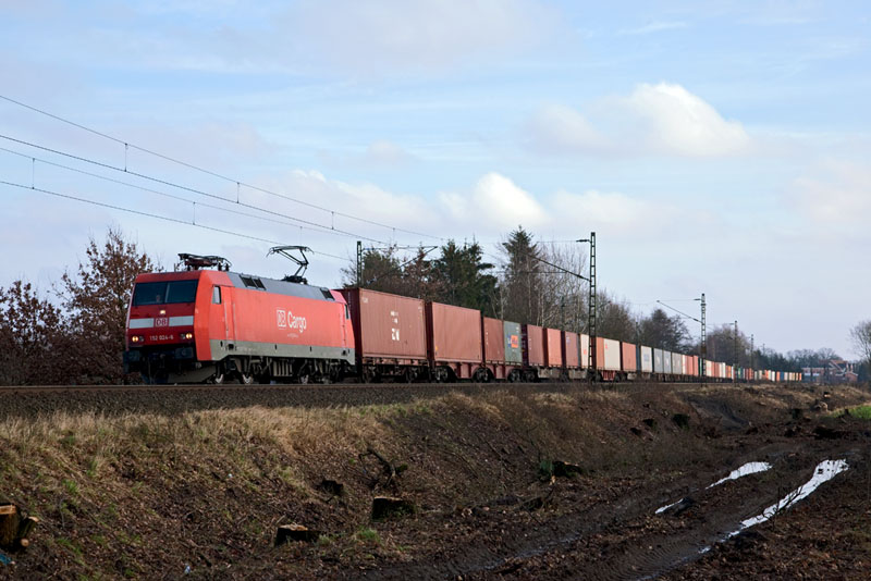 | Einen langen Containerzug hatte die starke 152 024-6 nordwärts zu bringen. Grevelau, 31. Dezember 2011 |
