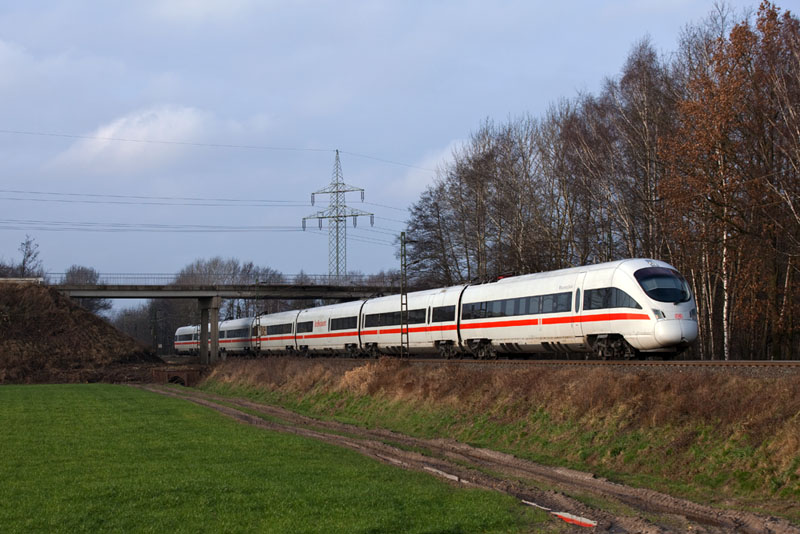 | Ein schneller ICE-T von Hamburg nach München mit dem Triebzug 411 010/510. Grevelau, 31. Dezember 2011 |