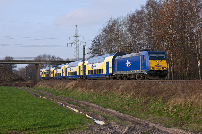 | Ha, endlich ist die Leihlok wieder bei uns – die 146 521-0 von Captrain vor einem MEr nach Lüneburg. Grevelau, 31. Dezember 2011 |