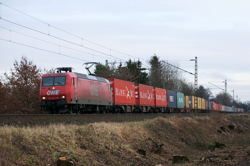 | Aus der Gegenrichtung kam auch noch die 145-CL 013 der OHE mit einem Containerzug. Grevelau, 31. Dezember 2011 |