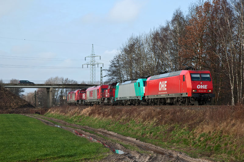 | Wieder die OHE, nun der dritte Eurorunner vor dem Red Tiger 330092 und einem Transwaggonzug. Grevelau, 31. Dezember 2011 |
