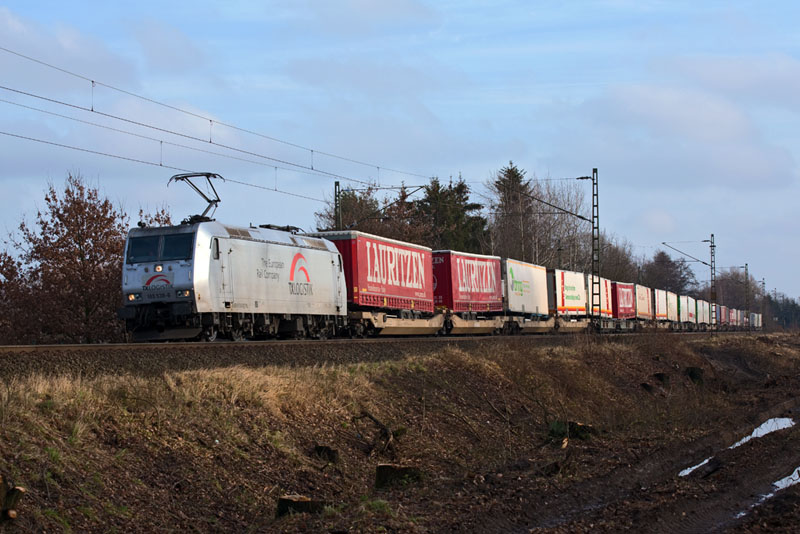 | Die TX Logistik mit der 185 538-6 vor dem KLV-Zug nach Skandinavien. Grevelau, 31. Dezember 2011 |