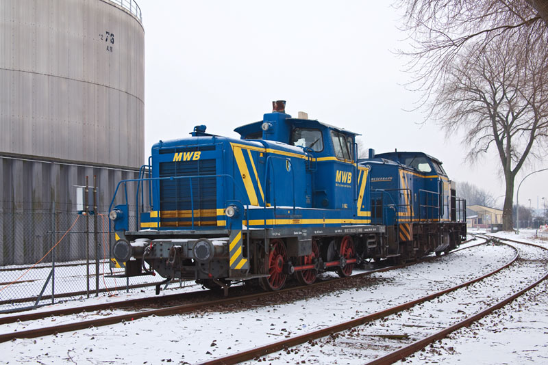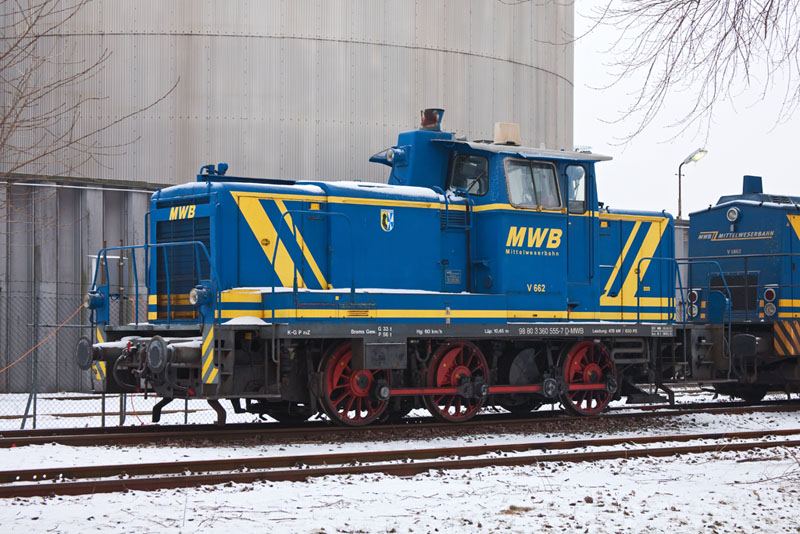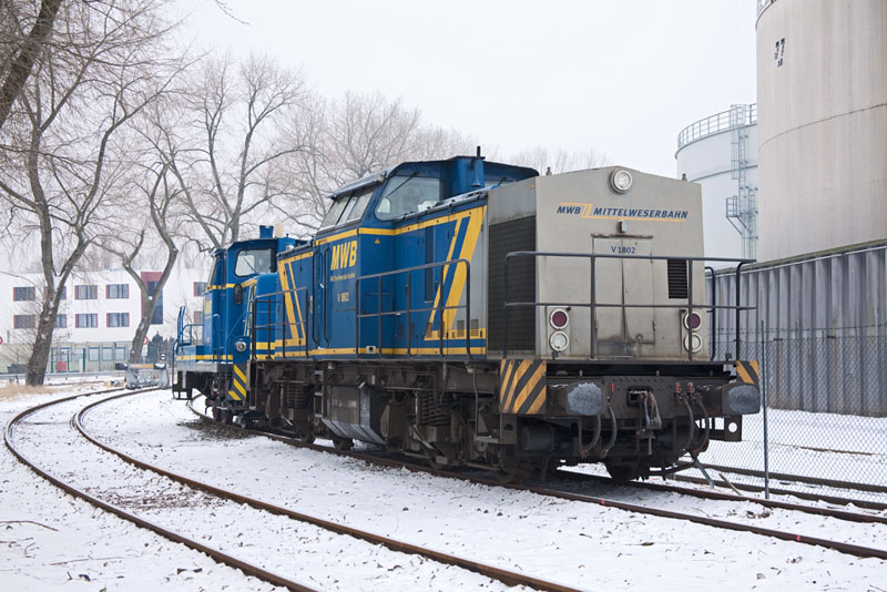 | Die V 662 und dahinter die V 1802 der Mittelweserbahn. Hamburg-Waltershof, 29. Januar 2012 |