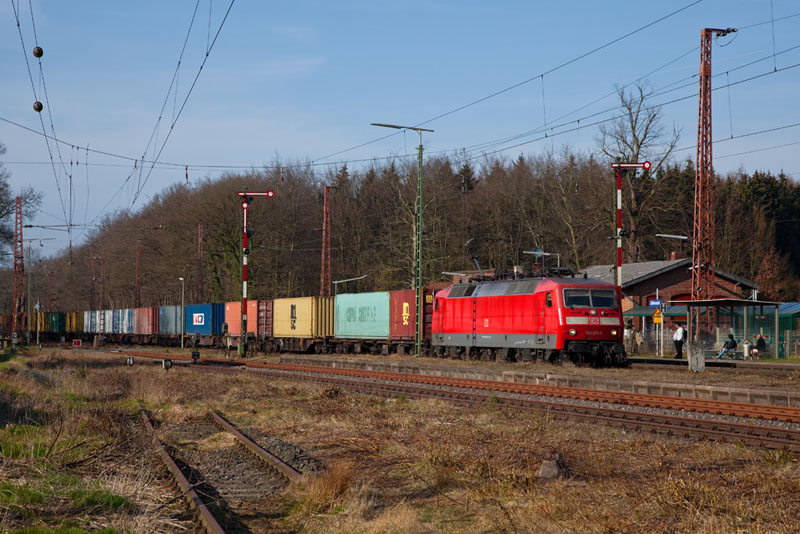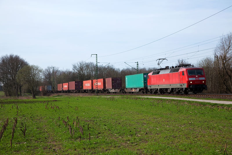| Die 120 123-5 mit einem Containerzug von Bremerhaven. Lübberstedt, 27. März 2012 |