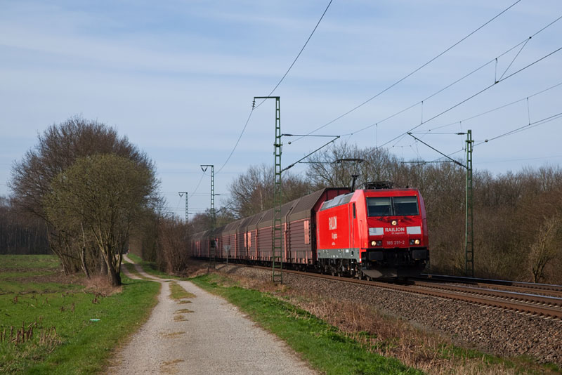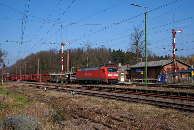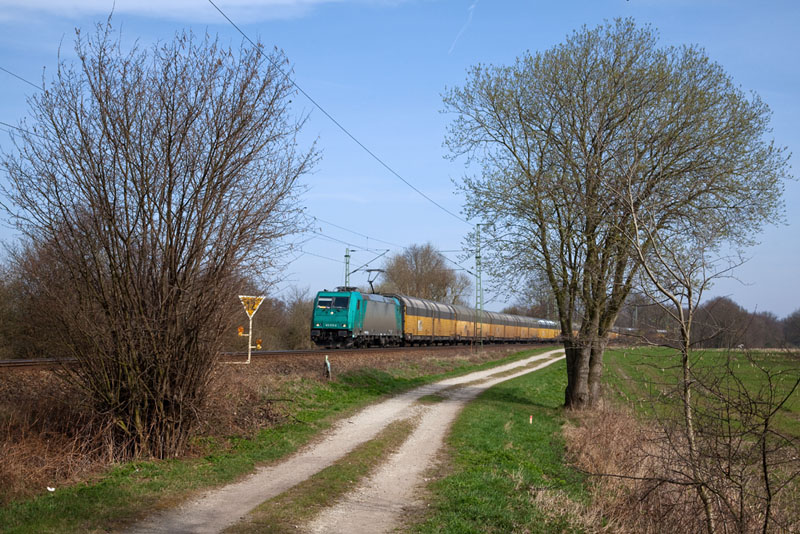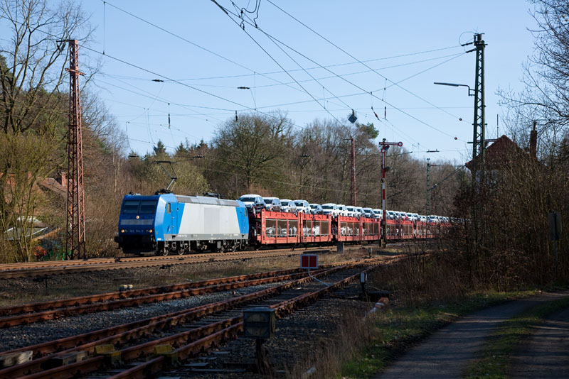 | Auf dem Weg nach Bremerhaven war dieser Autologistikzug mit der 185 291-2. Osterholz-Scharmbeck, 27. März 2012 |