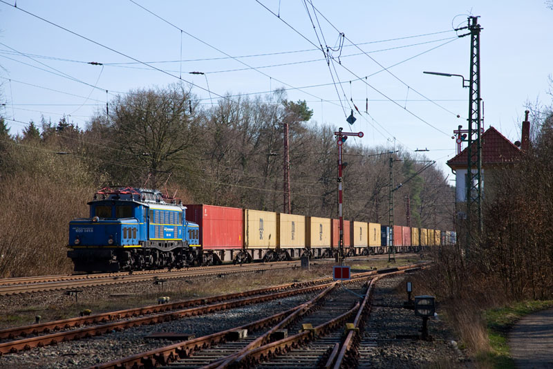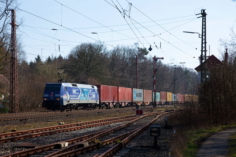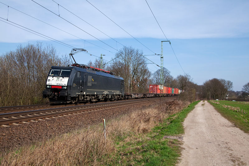 | Die ES 64 F4-151 mit einem Containerzug von Bremerhaven in den Süden. Osterholz-Scharmbeck, 27. März 2012 |