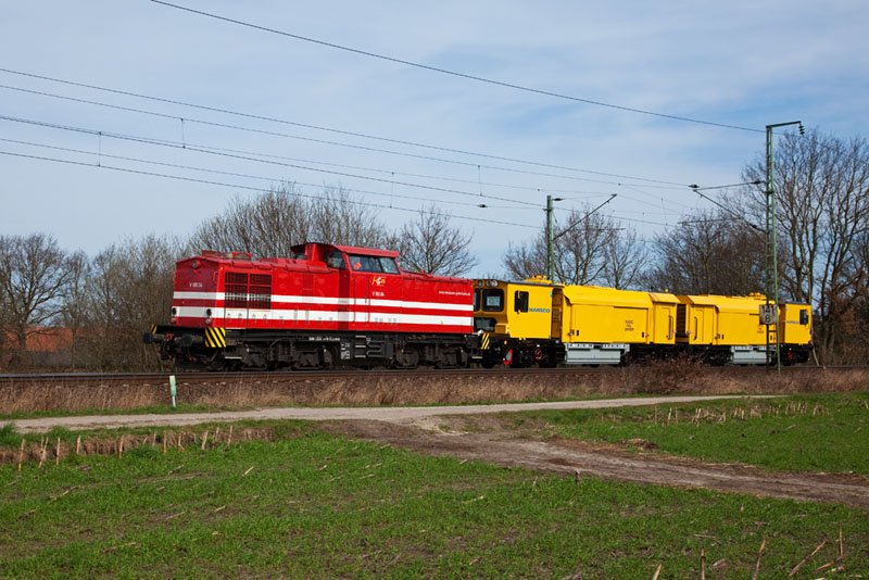 | Einen HARSCO-Schienenschleifzug hatte die V100.04 der HGB am Haken. Osterholz-Scharmbeck, 27. März 2012 |