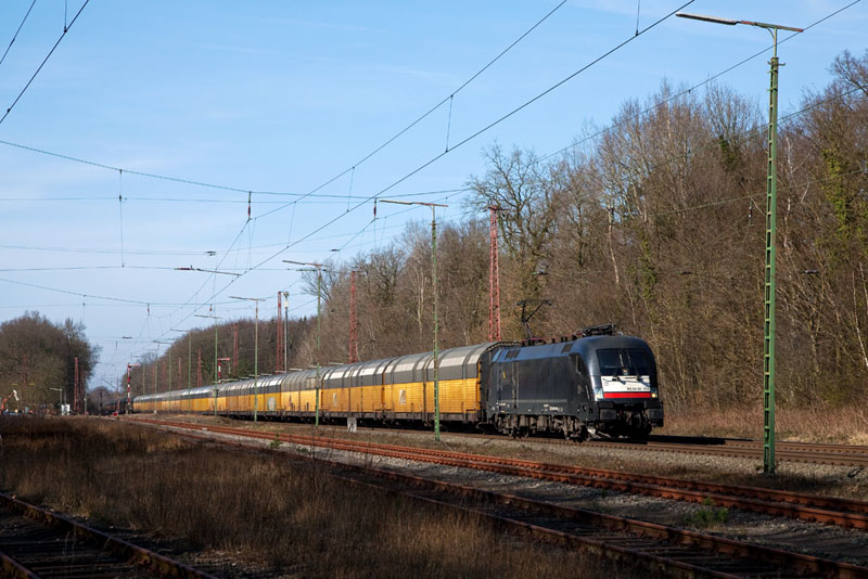 | Die ES 64 U2-014 mit einem weiteren Autologistikzug von Bremerhaven. Lübberstedt, 27. März 2012 |