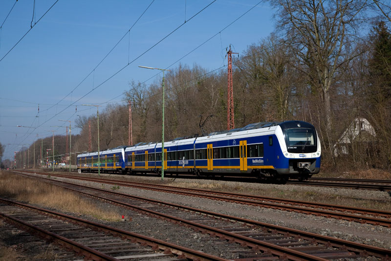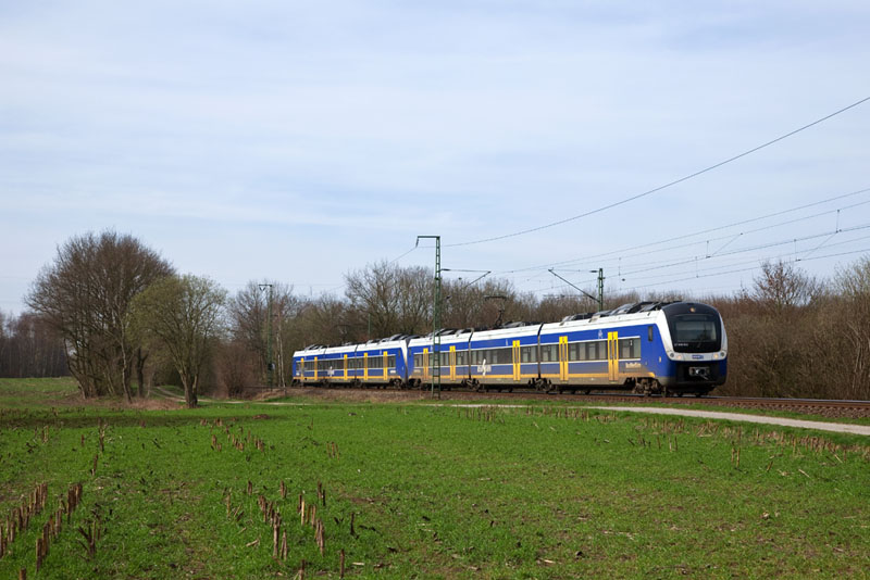| Die RS 2 nach Twistringen mit den ET 440 343 + ET 440 330 der NWB. Lübberstedt, 27. März 2012 |