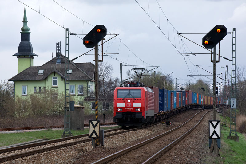 | Einfahrt eines Containerzuges nach Waltershof über Kattwyk mit der 189 013-6. Hamburg-Hohe Schaar, 1. April 2012 |