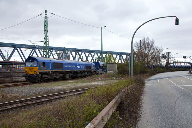 | Nun ist der Zug fast am Ziel, dem Baustoffterminal am Kirchenpauerkai. Hamburg-HafenCity, 1. April 2012 |