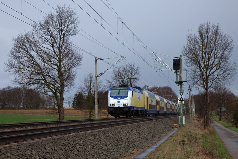 | Ein schneller metronom nach Bremen mit der 146 535-0 (ehemals "Rizzi-Lok"). Buensen, 1. April 2012 |
