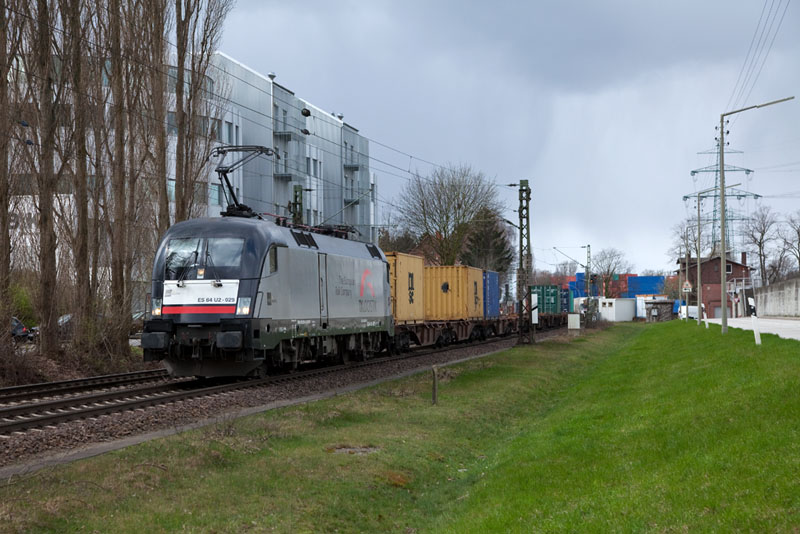 | Der schönste TXL-Taurus, die ES 64 U2-029, mit einem Containerzug aus dem Hafen. Hamburg-Unterelbe, 1. April 2012 |