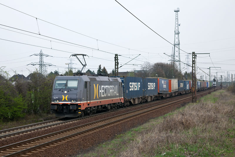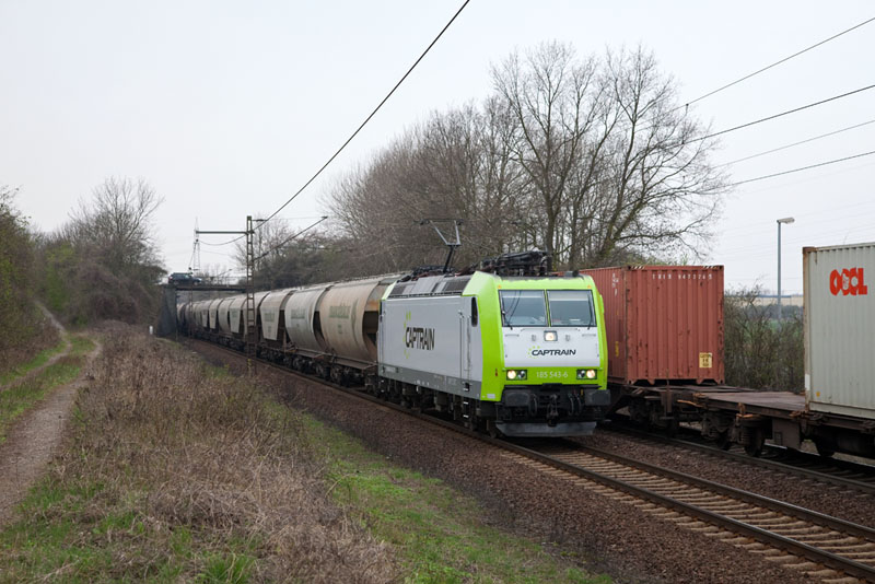 | Die ehemalige R4C-Lok 185 543-6 der Captrain mit einem Cerealienzug. Ahlten, 3. April 2012 |