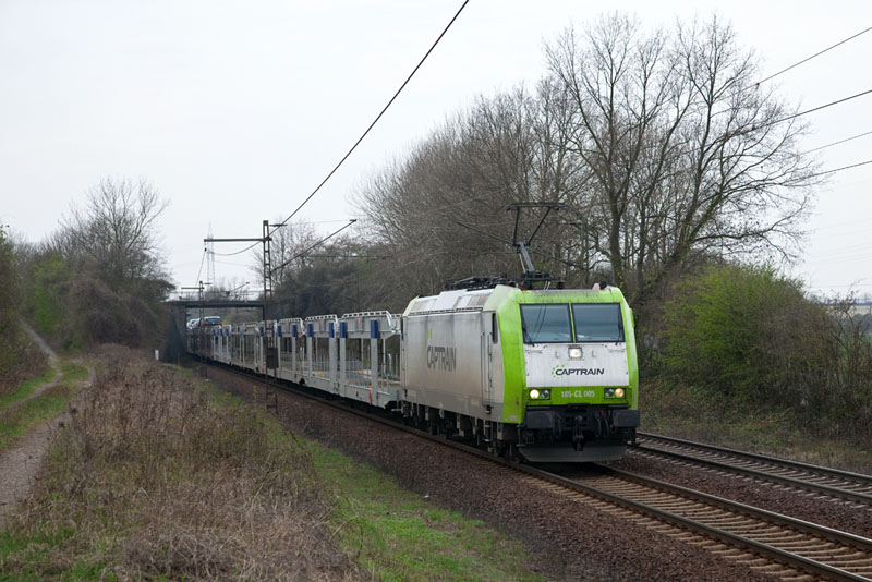 | Nochmal die Captrain, diesmal die 185-CL 005 vor einem BLG-Autologistikzug. Ahlten, 3. April 2012 |