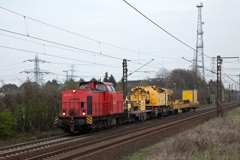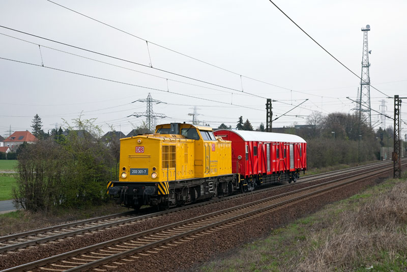 | Die 203 301-7 von DB Netzinstandhaltung mit dem Notfallgerätewagen. Ahlten, 3. April 2012 |