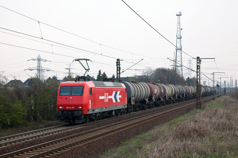| Die HGK 145-CL 012 mit einem rassigen Kesselwagenzug westwärts. Ahlten, 3. April 2012 |