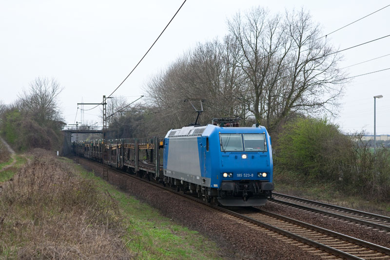 | Die 185 523-8 der HGK mit einem PCT Altmann-Autologistikzug. Ahlten, 3. April 2012 |