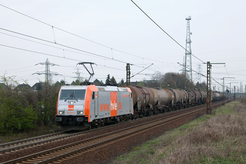 | Ha', und nun die 185 583-2 der Havelländischen Eisenbahn (HVLE) mit Kesselwagen gen Westen. Ahlten, 3. April 2012 |