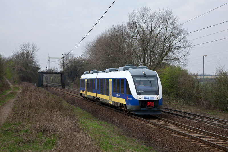| Auf Überführungsfahrt war dieser LINT-Triebwagen VT 648 191 der Nordwestbahn (NWB). Ahlten, 3. April 2012 |