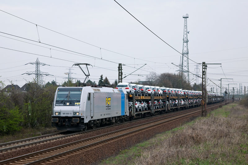 | Nagelneue AUDIs brachte die 185 690-5 der PCT Altmann-Gruppe nach Bremerhaven. Ahlten, 3. April 2012 |