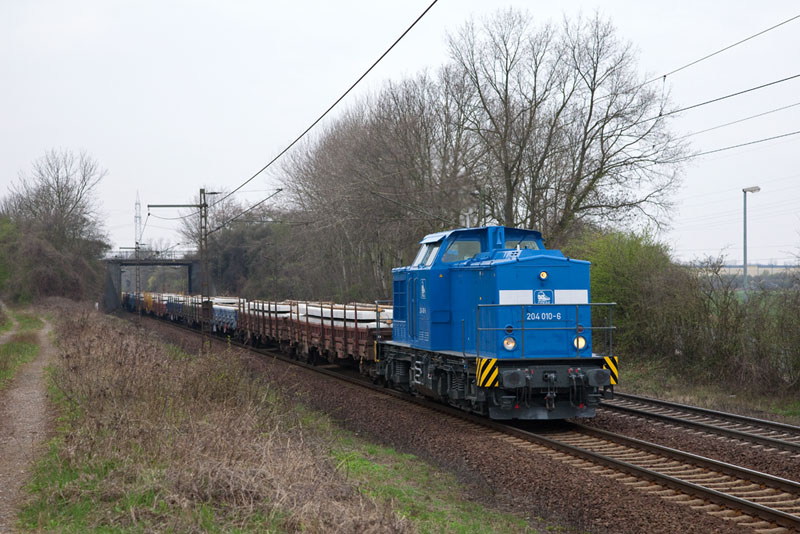 | Mit neuen Betonschwellen auf Rungenwagen fuhr die 204 010-6 der PRESS ostwärts! Ahlten, 3. April 2012 |