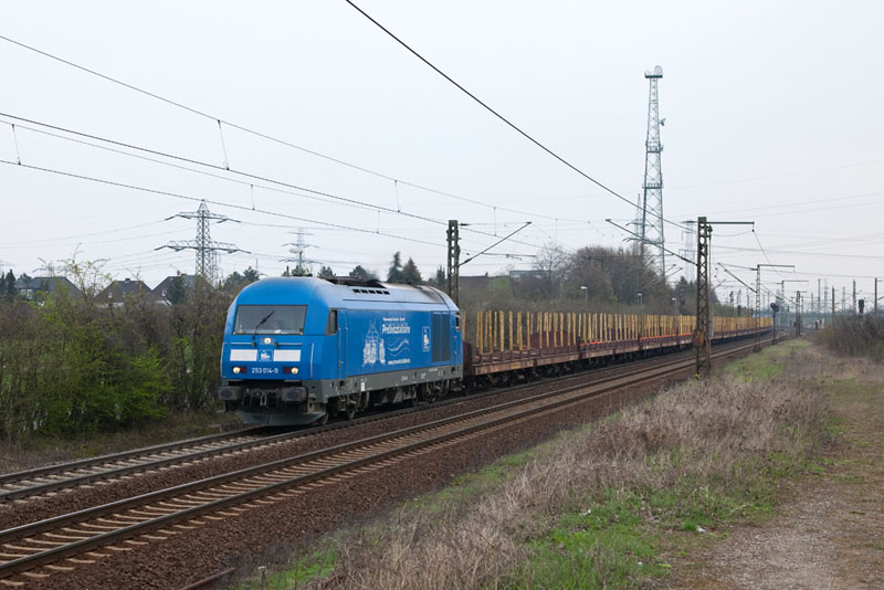| Schick, die 253 014-9 der Pressnitztalbahn (PRESS) mit einem Holzleerzug von Niedergörne. Ahlten, 3. April 2012 |