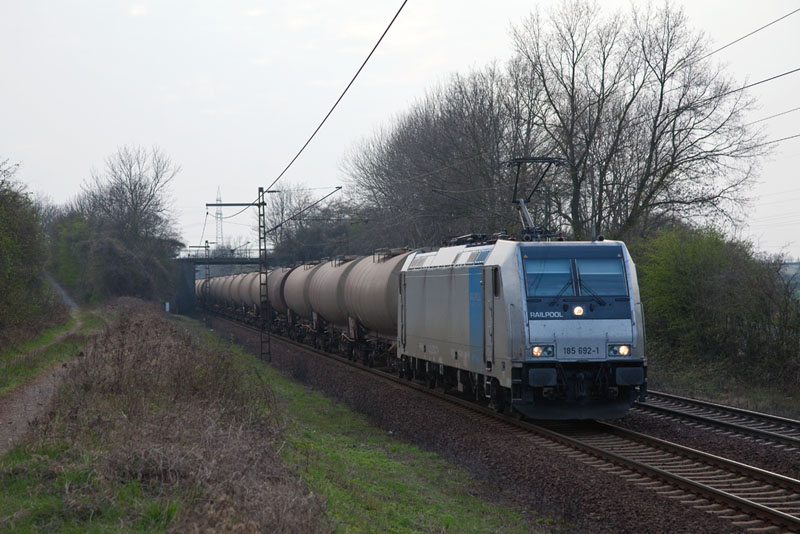 | Die 185 692-1 der Rurtalbahn vor einem schweren Kesselwagenzug. Ahlten, 3. April 2012 |