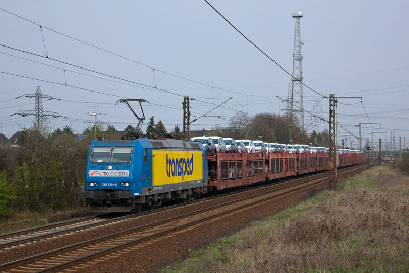 | Noch mehr neue Autos für Bremerhaven, die 185 518-8 "transped" der TX Logistik. Ahlten, 3. April 2012 |