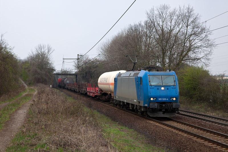 | Einen gemischten Güterzug nach Peine hatte die 185 520-4 der VPS am Haken. Ahlten, 3. April 2012 |